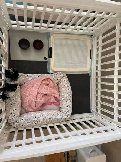 Please have a pen similar to this set up before you pick up your puppy. This pen provides a safe environment with everything they need. This is the type of pen they are using here, from weaning to pick up. They need to have access to food and water 24/7 to prevent hypoglycemia. They are trained to use the potty pad starting at four weeks old. While you can not take them into the grass until the shots are finished, any exposure to soil or standing water, from being in a lanai or deck will expose them to parasites like Giardia and Coccidia.